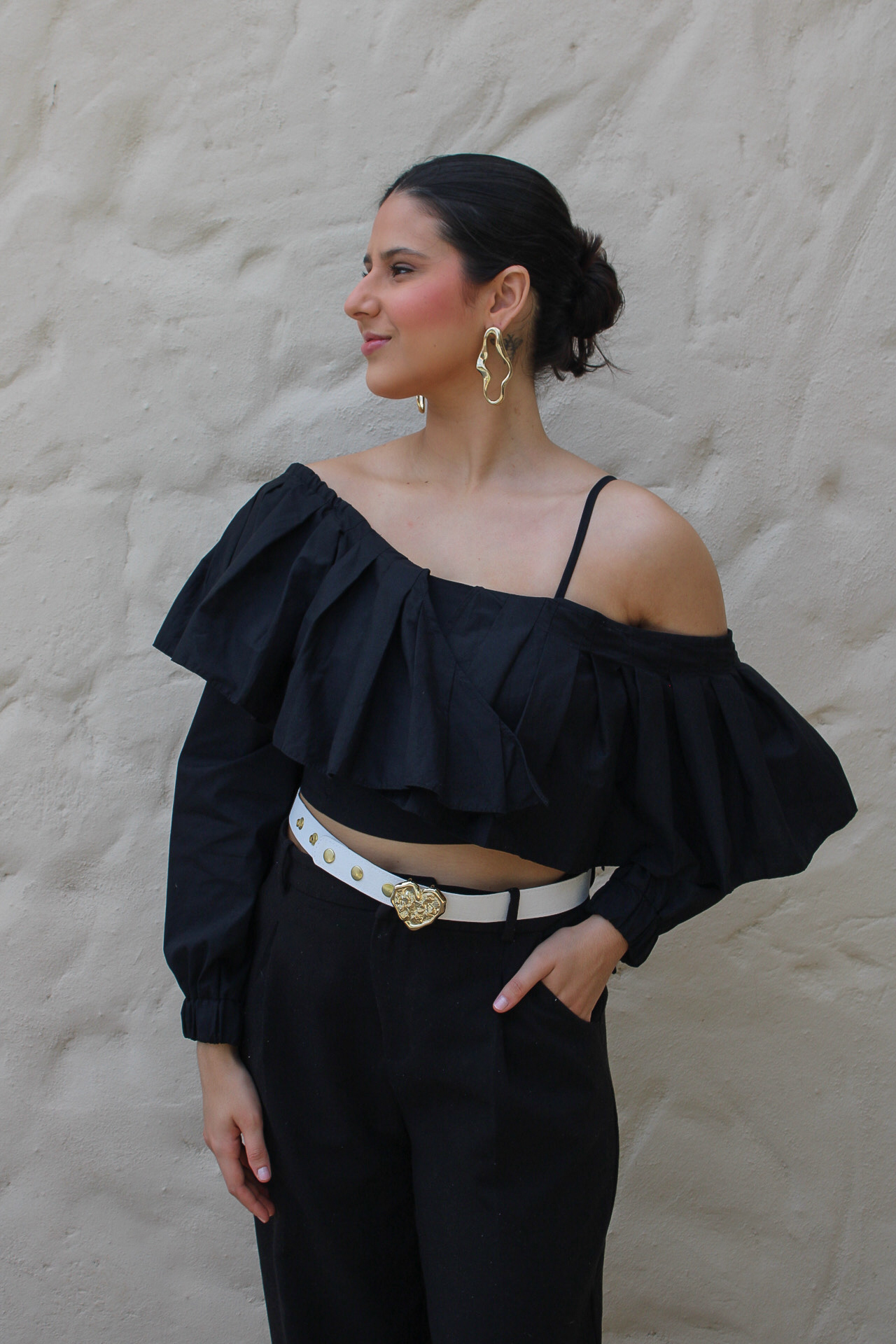 O cropped de babados traz uma modelagem ombro a ombro sofisticada e cheia de personalidade. As mangas assimétricas e um design estruturado equilibra modernidade e leveza. Uma peça versátil pra compor looks autênticos e marcantes.